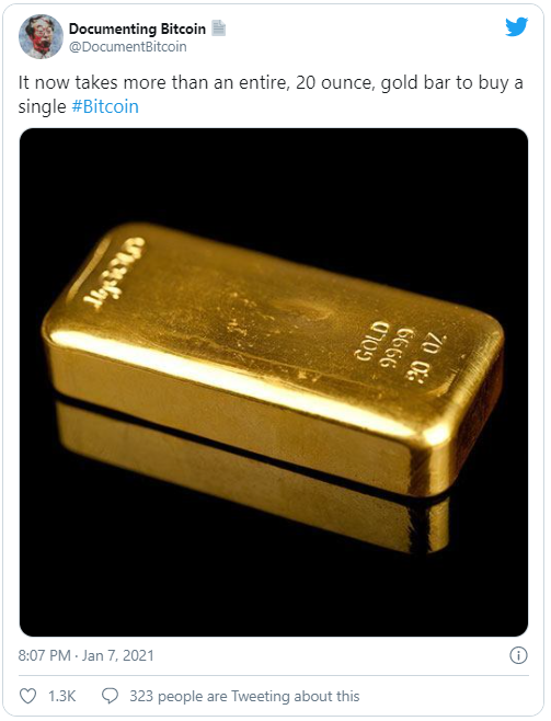 20 onsluk bir altın külçesi şu anda yaklaşık olarak 38.240 dolar bandında işlem görüyor. Dolayısıyla aslında Bitcoin 40.400 dolarlık rekoru ile bu rakamı bile geride bırakmış oluyor. Ama yaşanan düzeltmeler ile artık 1 Bitcoin’in 20 onsluk bir altın külçesine eşit olduğu ifade edilebilir.