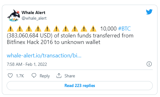 Whale Alert izleme hizmetine göre, 2016 Bitfinex saldırısında çalınan yaklaşık 5 milyar dolarlık Bitcoin, bilgisayar korsanları tarafından bilinmeyen bir cüzdana taşındı. Elde edilen bilgilere göre, ilk işlem saat 4:00 UTC’de yapıldı. “uxwczt” ile biten anonim bir cüzdana toplam 383 milyon dolar değerinde Bitcoin gönderildi. Cüzdanın bir borsaya mı yoksa bir OTC platformuna mı ait olduğu henüz belirlenmedi, ancak 2016’dan beri sürekli olarak BTC gönderildiği biliniyor.