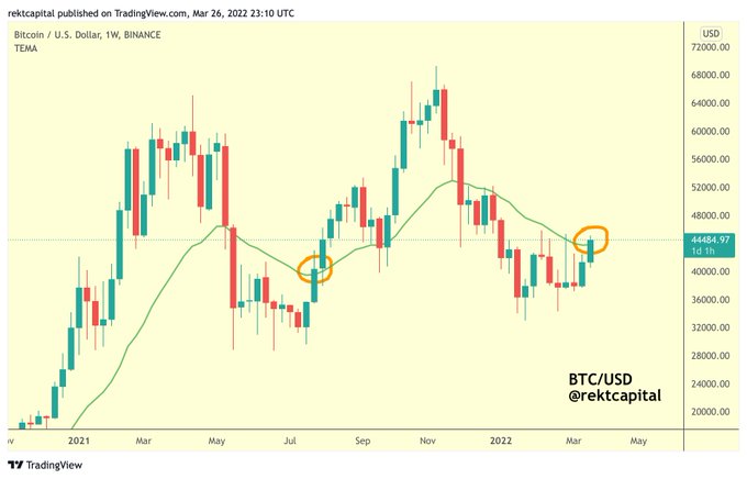 Son 24 saatte 45.000 dolar sınırına dayanan Bitcoin fiyatı 44.950 dolardan geri döndü. Fiyat 44.140 doların altına sarkmadı ve haftalık kapanış için umutlu bekleyiş devam ediyor. Popüler kripto para analisti Rekt Capital, Bitcoin‘in 21 haftalık üstel hareketli ortalamasının (EMA) da direnç olarak bir dönüş için uygun olduğunu söyledi. Geçtiğimiz yıl bu bölge boğaların çok işine yaramıştı.