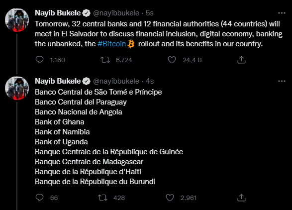 Bukele konuyla ilgili yaptığı açıklamalarda, “Yarın, 32 merkez bankası ve 12 finans otoritesi (44 ülke), finansal konular, dijital ekonomi, bankasız finans, Bitcoin’in piyasaya sürülmesi ve ülkemizdeki faydalarını görüşmek üzere El Salvador’da bir araya gelecek” sözlerini kullandı.
