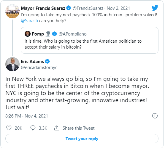 Aslında bu savaş durumu Miami belediye başkanı Francis Suarez, bir sonraki maaşının tamamını Bitcoin olarak kabul edeceğini duyurmasıyla başladı. New York belediye başkanı seçilen Eric Adams, çıtayı daha da yükselterek ilk üç maaşını Bitcoin’de alacağını açıklayarak meydan okumaya dahil oldu.