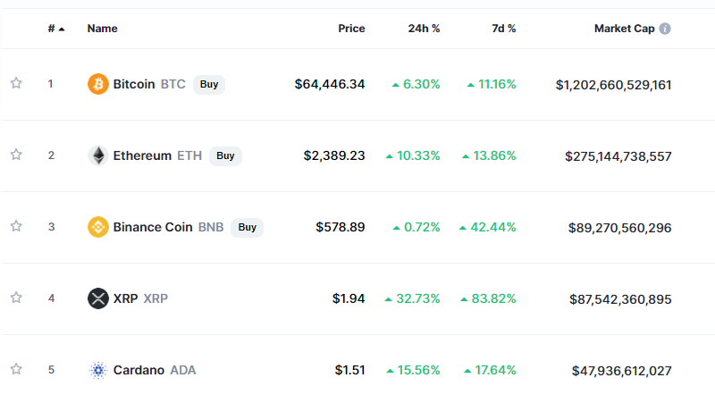 Bitcoin’in yanı sıra piyasa değeri bakımından en büyük altcoin konumunda yer alan Ethereum da yeni bir rekor kırdı 2.400 doları gördü. Ayrıca piyasa hacmi bakımından en büyük dördüncü kripto para olan XRP’de 2018 sonrasındaki en iyi performansını sergiliyor ve 2 dolar sınırında hareket ediyor.