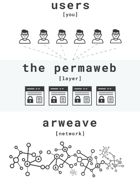 Arweave ağının (network) üstünde “permaweb” var. Burası herkesin katkıda bulunabileceği veya bakım/sürdürülebilirlik hizmetleri karşılığında para kazanabileceği küresel, topluluğa ait bir web.