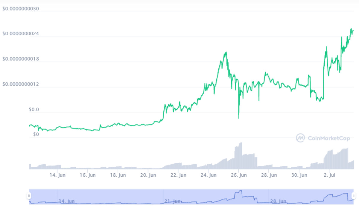 Baby Doge Coin, bu yazının kaleme alındığı an itibarıyla birkaç borsa tarafından listeleniyor. Bununla birlikte Baby Doge Coin güncel fiyatı 0,000000000218 olarak kaydedildi. Ayrıca Baby Doge, yaklaşık olarak dört hafta önce piyasaya sürüldü ve o günden bu yana %600’ün üzerinde artış elde etti. Bu fiyat artışı büyük bir kitleye sahip Dogecoin topluluğundan kaynaklanıyor.