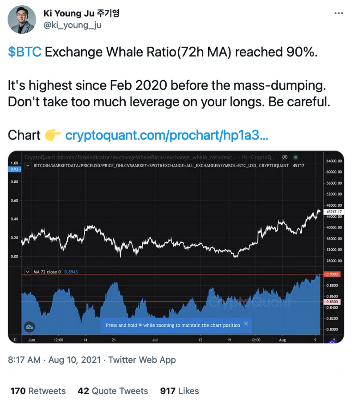 Zincir üstü analitik veri sağlayıcısı CryptoQuant’ın kurucu ortağı Ki YOung Ju, ağusto ayında balinaların hareketlerini izleyen bir grafik paylaştı. 72 saatlik hareketli ortalama verilerine göre borsalardaki Bitcoin balina oranı %90’a ulaştı. Bu metriğin “13 Mart Kara Perşembe” olarak bilinen Bitcoin’in %50 geri çekildiği günün ardından en yüksek seviyelerden birini gördüğü belirtildi.