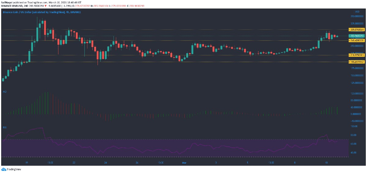 BNB fiyatı, ani destek ve direnç noktasının ortasında işlem gördüğü için direnç seviyesi 305 dolar olarak belirlendi. Binance Coin (BNB), geçen haftadan itibaren kaydettiği %12’lik sağlıklı büyüme çizgisiyle, piyasa değerine göre en büyük kripto para birimleri listesinde üçüncü sıraya yerleşti. Müthiş Osilatör indikatörü güçlü satın alma ivmesi kaydetti. RSI aşırım alım bölgesine yakın seyretti. Göstergeler konularını korursa, BNB tüm zamanların en yüksek seviyesini test edebilir. Binance Coin (BNB), haberimizin yazıldığı sırada 283 dolar seviyelerinde işlem görüyor.