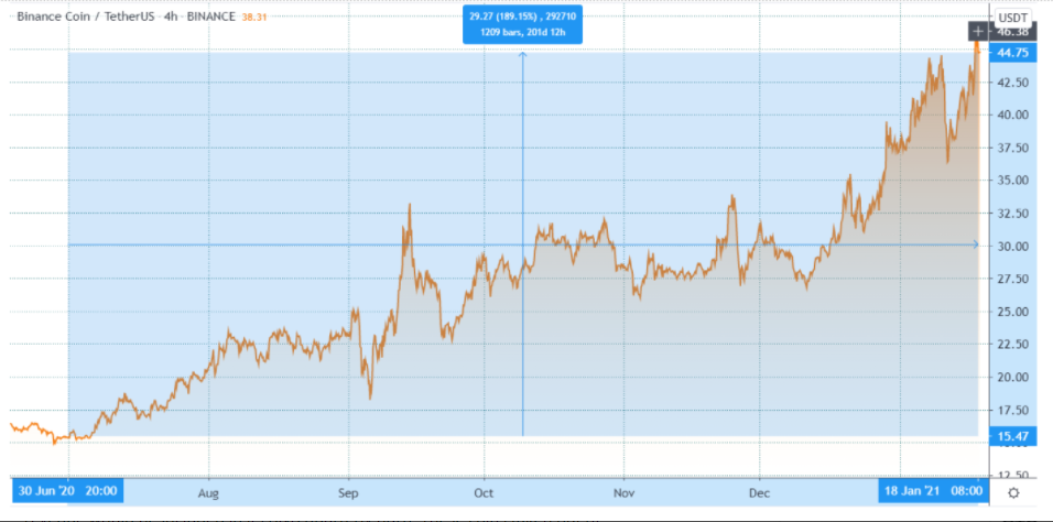Geçtiğimiz 6 ayda Binance Coin (BNB) sessizce yükselişe geçti, bu dönemde %189 kazandı ve 18 Ocak’ta tüm zamanların en yüksek seviyesi 46.90 dolara ulaştı. Bu fiyat zirvesi, BNB yakımından sadece bir gün önce gerçekleşti ve yatırımcılar, yakım sona erdiğinde BNB fiyatının yükselip yükselmeyeceğini merak etmeye başladı.