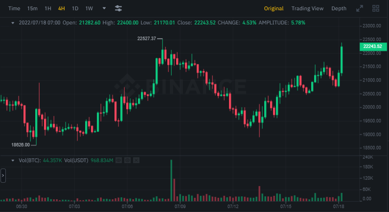 Lider kripto para birimi Bitcoin yeni haftaya oldukça iyi başladı ve fiyat 22.000 dolar üzerine yükseldi. Mevcut grafikler değerlendirildiğinde ise fiyatta yukarı yönlü hızlı hamleler olduğu görülüyor.