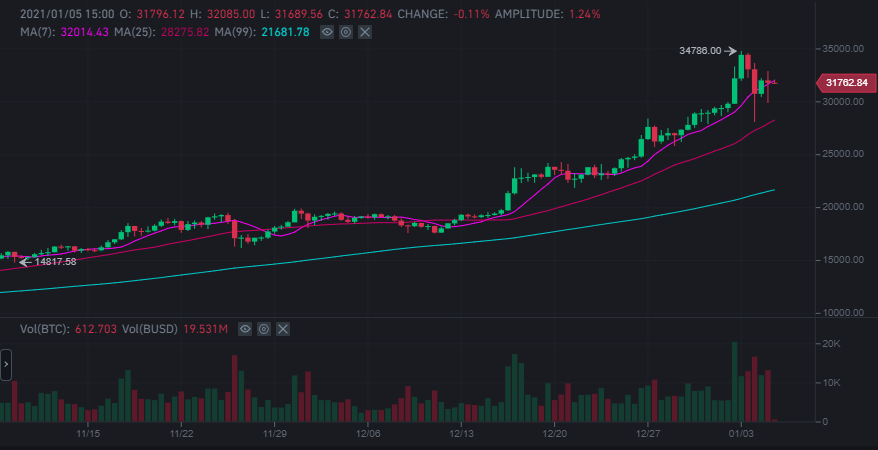 Lider kripto para birimi Bitcoin son zamanlarda oldukça volatil bir tablo çiziyor. 16 Aralık’ta yükseliş grafiğine hız veren Bitcoin eski rekoru olan 20.000 doları kırdıktan sonra 15 gün içinde 34.768 dolar ile yeni rekor seviyesini belirlemiş oldu. Daha sonra 3 Ocak itibari ile bir düşüş grafiği çizen ve saatler içinde 5.000 dolar çizen Bitcoin bugün kendisini toparladı ve yeniden 30.000 doların üzerinde işlem görüyor.