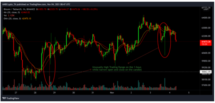 Tutarlı düşüş ve istikrarlı toparlanma genellikle BTC‘nin sergilemeye ve bizim de görmeye alışık olduğumuz hareketler. Ancak geçen günlerde görülen bazı grafik hareketlerinin alışılanın dışında olduğu ifade ediliyor. Bitcoin 28 Ekim’de saatlik grafiklerde %5,5 ve 3 Kasım’da yine saatlik grafiklerde %4,4 düşüşler yaşadı. Ancak mumların açılış ve kapanış değerlerinin oldukça dar olduğu görülüyor.