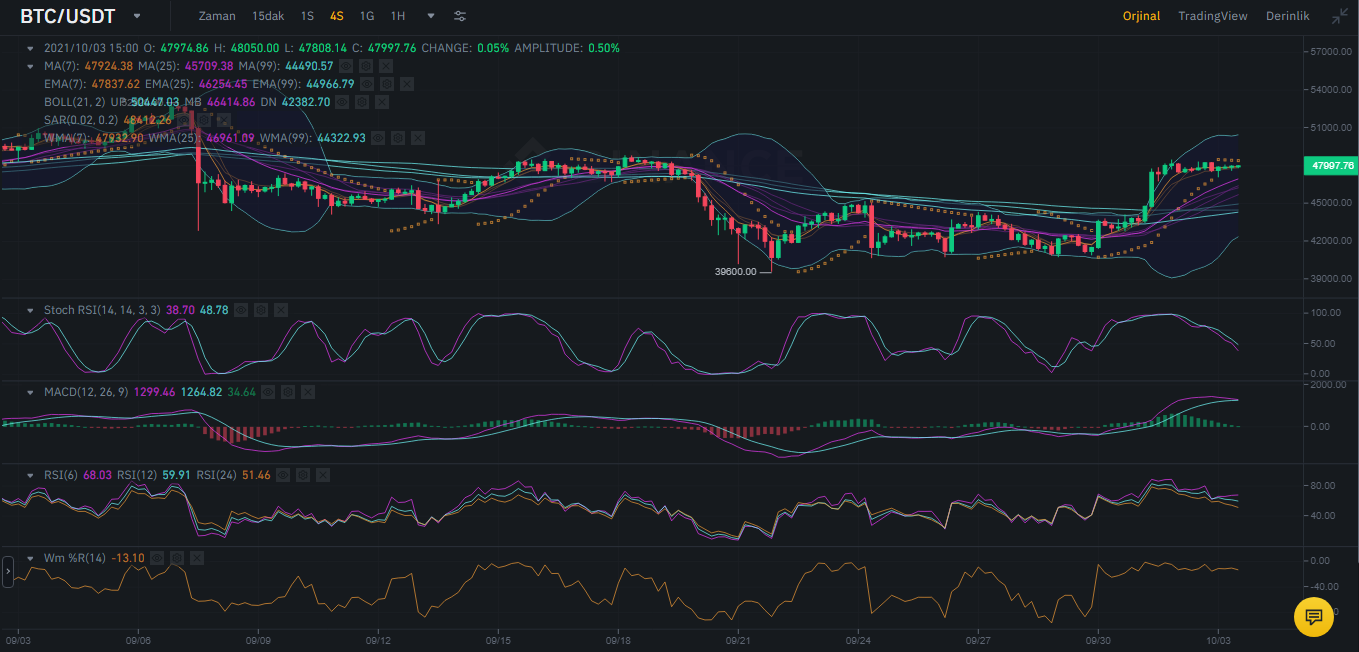 Yazı hazırlandığı sırada Bitcoin (BTC) 47.800 dolardan alıcı bulmaya devam ediyor. Birkaç kere 48.495 dolar direncini aşamayan fiyat buradan geri çekildi. Bugün 48.000 dolar üzerine çıksa da direnç maalesef aşılamadı. Haftalık kapanışın yaklaşması ve yarın için küresel piyasaların pozitif açılacağının bekleniyor olması fiyatı destekliyor.
