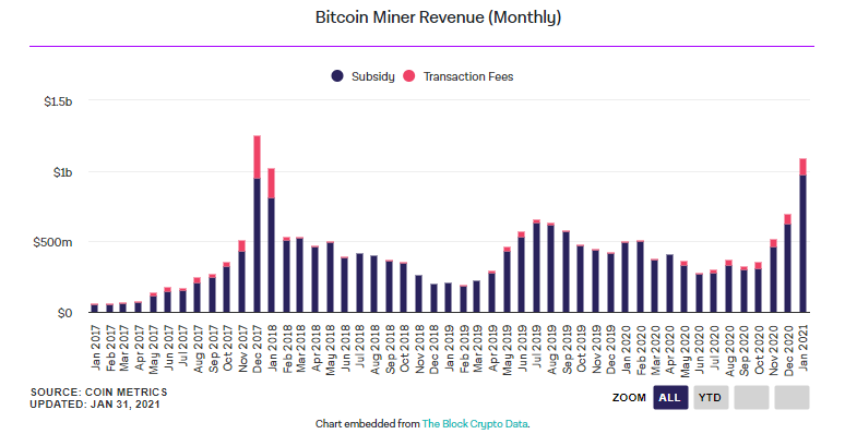 Elde edilen verilere göre geçen ayki 1 milyar dolarlık gelirin 977 milyon doları, ağın blok sübvansiyonlarından geldi. Bitcoin fiyatı 30.000 doların üzerine çıktığı ve 42.000 dolara kadar yükseldiği için değeri Aralık 2020’ye kıyasla keskin bir şekilde yükselmiş oldu.