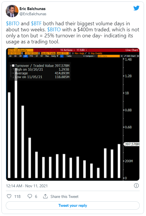 Öte yandan BITO veya ProShares Bitcoin ETF, ETF’nin yeni listelendiği Ekim ayının ortasından bu yana en yüksek rakam olan 400 milyon dolarlık işlem gördü.