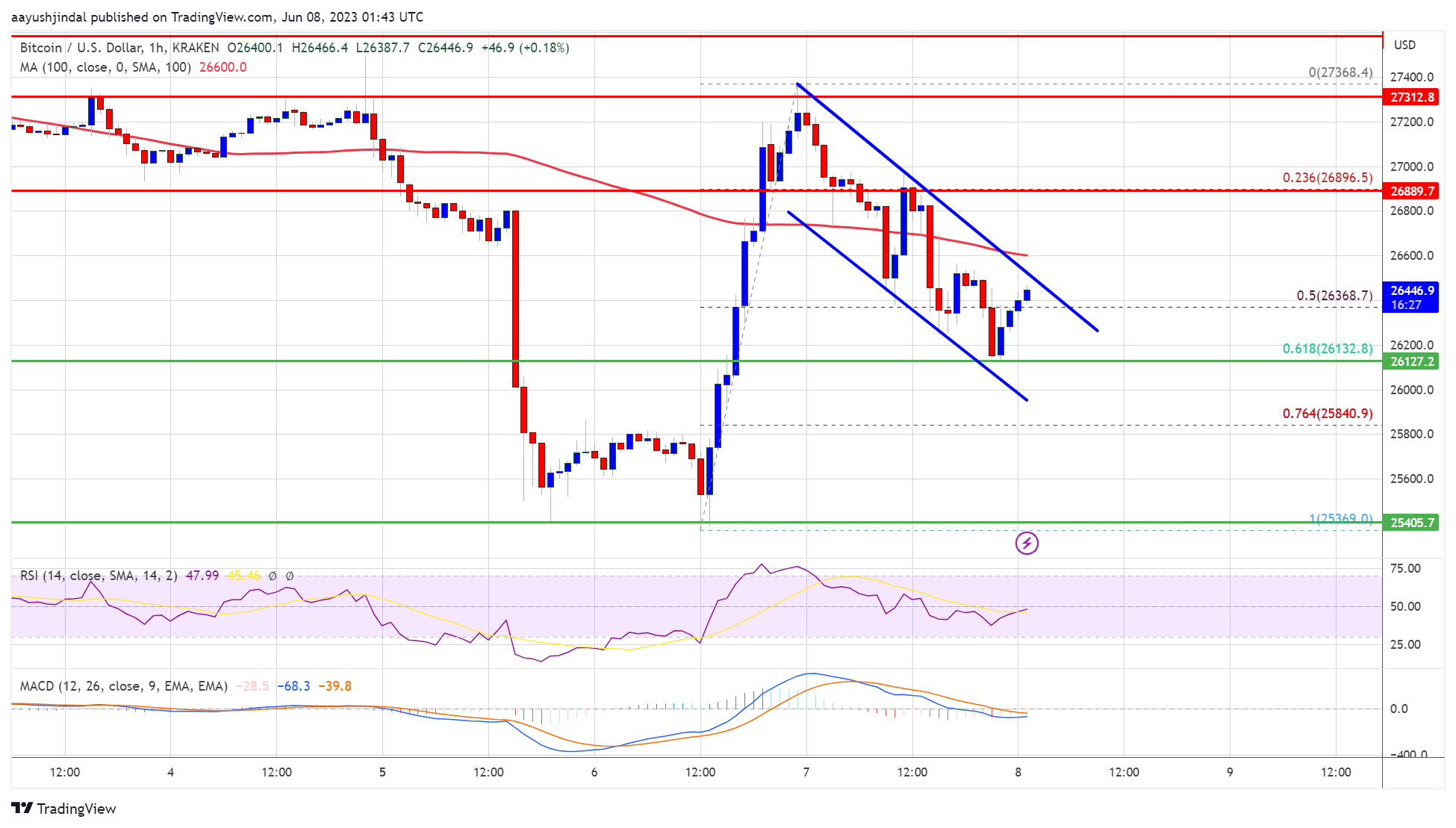 Bitcoin fiyatı yeni bir düşüşe başlamadan önce 27.368 dolar civarında bir yüksek seviye oluşturdu. Daha sonra 27.000 dolarlık destek bölgesinin altına bir hareket oldu. BTC fiyatı, 25.368 dolardan 27.368 dolara yükseliş hareketinin %50 Fib geri çekilme seviyesinin altına düştü. Bununla birlikte Bitcoin fiyatı şu anda 26.600 doların ve 100 saatlik basit hareketli ortalamanın altında işlem görüyor. BTC/USD paritesinin saatlik tablosunda 26.580 dolar civarında dirençle oluşan önemli bir düşüş kanalı da var.