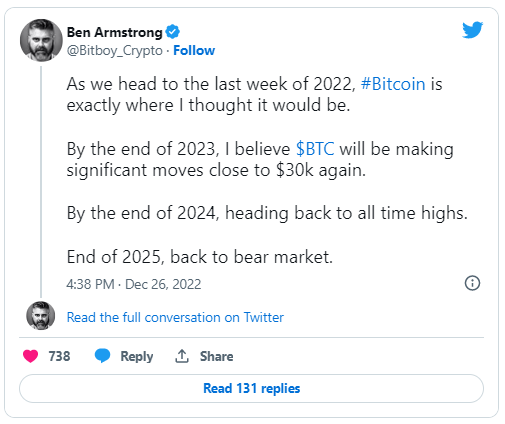 Armstrong’un yakın zamanda attığı bir tweet’e göre, Bitcoin şu anda olmasını beklediği seviyede ve 16.800 $ bölgesinde. Önümüzdeki yılın sonunda BTC’nin tekrar 30.000 seviyesine yaklaşmaya başlayacağını düşünüyor. Tüm zamanların en yüksek seviyesine çıkma olasılığına gelince, tweet’ine göre bunun 2024’ün sonunda gerçekleşmesi muhtemel.