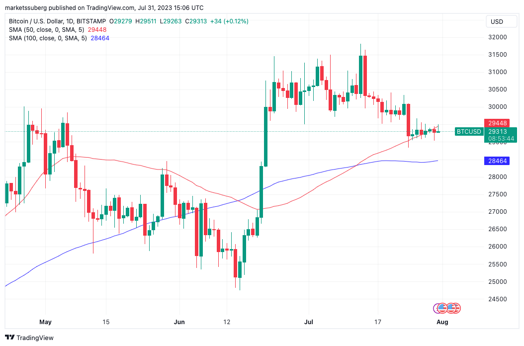 Uzmanların Bitcoin (BTC) analizleri, potansiyel bir düşüşle ilgili uyarılarda bulunurken kripto para birimi, 31 Temmuz Wall Street açılışında sabit kaldı. TradingView’den gelen verilere göre, Bitcoin’in temmuz ayının son işlem gününde daha yatay bir hareket sergilediğini gösterdi.