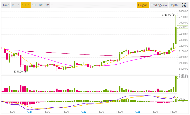 Lider kripto para birimi Bitcoin (BTC) geçtiğimiz bir saat içinde değerini 7.250 dolar seviyesinden 7.738 dolar seviyesine kadar çıkarmayı başardı.