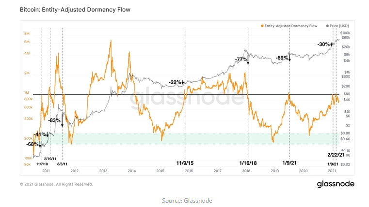 Bu durum tersine Martinez, Entity-Adjusted Dormancy Flow bir milyon eşiği geçmeden reddedildiğinde Bitcoin’in fiyatının bir geri çekilme yaşadığını belirtti. 2021’de bu, Ocak’ta ve Şubat sonunda en az iki kez oldu.