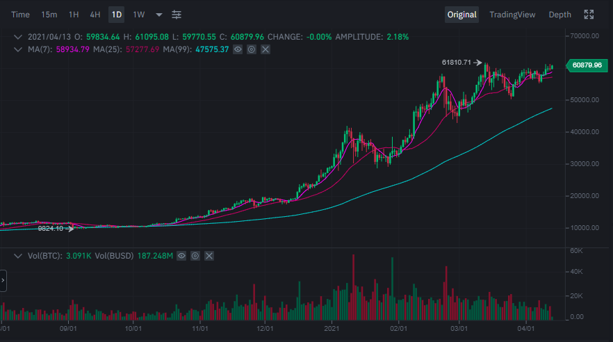 Bitcoin şu anda 60.000 doların üzerinde işlem görmeye devam ediyor. Yalnızca geçen yıl içinde, piyasa değerine göre en büyük kripto para birimi, Nisan ayından bu yana günlük ortalama %0,65 oranında büyüdü ve bu da değerde yaklaşık on kat artışla sonuçlandı.