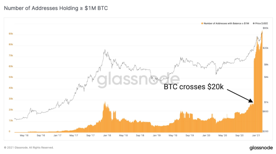 Glassnode’daki analistler, şu anda 1 milyon dolardan fazla Bitcoin bulunduran 94.000 BTC adresi olduğunu açıkladı ve “ATH: Şu anda en az 1 milyon dolar değerinde BTC tutan 94.000’den fazla Bitcoin adresi var. Aralık ortasındaki keskin artış, BTC’nin 20.000 doları geçtiği noktayı işaret ediyor.”