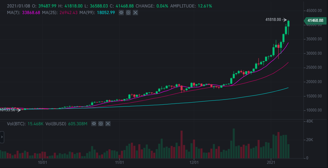 Lider kripto para birimi Bitcoin (BTC) bugün yeni bir rekora imza attı ve 41.818 doları gördü. Her ne kadar yazının yayına hazırlandığı sırada bir geri çekilme yaşanmış olsa da BTC hala 41.000 doların üzerinde seyrediyor.