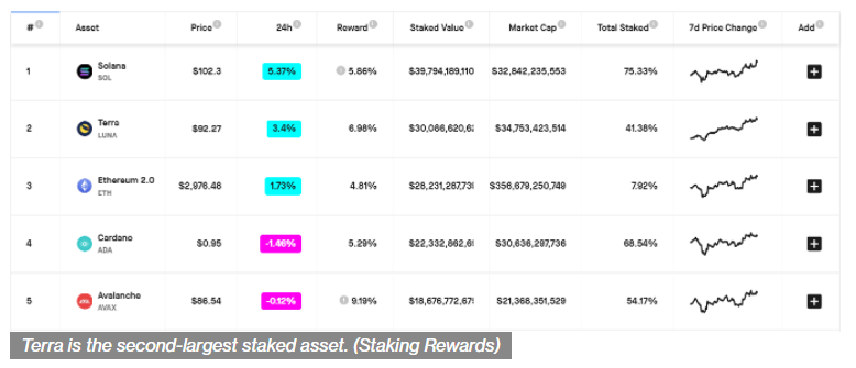 Verilere göre, Terra (LUNA) token’ında geçen haftaki fiyat artışı, onu tüm büyük kripto para birimleri arasında stake edilen en büyük ikinci varlık haline getirdi. LUNA, bu yazının yazıldığı sırada 28 milyar doların biraz üzerinde stake değeri olan ETH’u geride bıraktı.