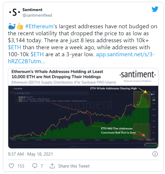 Kripto para analiz firması Santiment’ten alınan veriler Ethereum (ETH) balinalarının (cüzdanlarında 10.000’in üzerinde ETH bulunanlar), ETH’nin değerinin tüm zamanların en yüksek seviyesinden %25’in üzerinde düştüğü son piyasa satışları sırasında hareket etmediğini gösteriyor.
