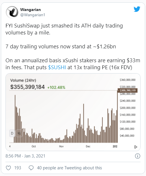 Elde edilen son veriler, SushiSwap günlük hacim rakamının tüm zamanların en yüksek seviyesine ulaştığını gösteriyor. DeFiance Capital’de bir yatırım analisti olan Darryl Wang’ın belirttiği gibi, SushiSwap’teki günlük işlem hacmi 355 milyon dolarla tüm zamanların en yüksek seviyesine ulaştı.