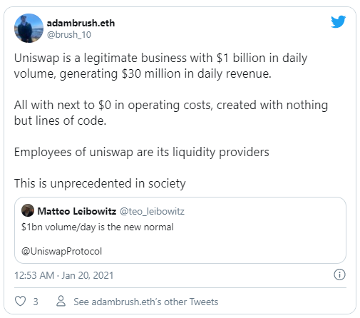 Bunlara ek olarak Uniswap strateji Lideri Matteo Leibowitz, 1 milyar dolarlık işlem hacminin kalıcı olduğunu, “Günlük 1 milyar dolarlık hacim yeni normaldir.” ifadeleri ile dile getirdi. Ayrıca Adams bunu New York Borsası ile karşılaştırdı ve “NYSE’nin % 2’si Uniswap için yeni normal. %100 ne zaman?” sözlerini kullandı.