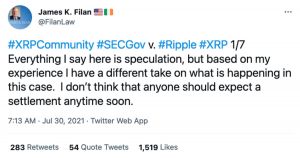 Connecticut merkezli Filan LLC’nin kurucusu James Filan, Ripple ile SEC arasındaki davada yakın zamanda anlaşmanın yolunun görülmediğine inanıyor. Filan, Twitter’dan yaptığı açıklamalarda Ripple ve SEC arasında bir uzlaşma fikrinin uygulanabilir olmadığı kanaatine vardı.
