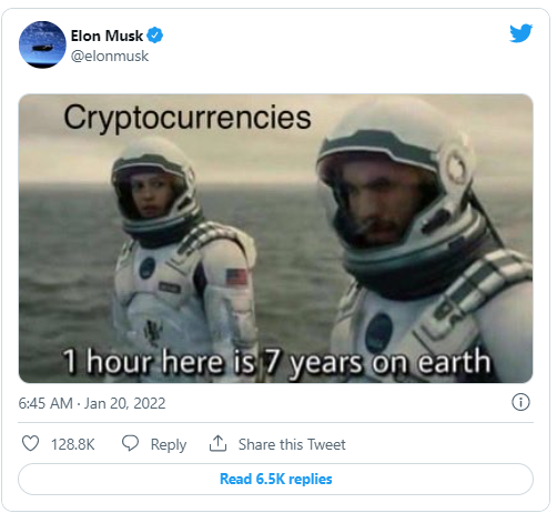 Musk yaptığı paylaşımda, kripto para birimlerinde geçen 1 saatin 7 yıl hissi verdiğini ifade etti. Elon Musk sıkı bir Dogecoin savunucusu olduğu içinde bu paylaşım direk olarak DOGE fiyatını etkiledi.