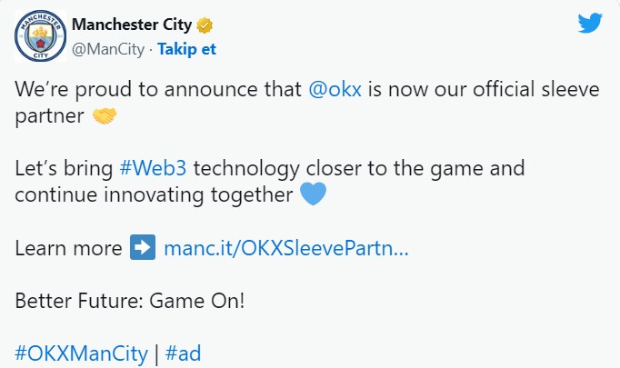 Benzer şekilde OKX de yeni sponsorluk anlaşması hakkında tweet attı ve “Web3 teknoloji buluşması Futbol’un gücüyle taraftarları yenilemeye ve güçlendirmeye hazır” dedi. Manchester City’den yapılan duyuruya göre, OKX ile ortaklık, borsanın “dünya çapındaki milyonlarca futbol taraftarına” tanıtılmasına şimdiden yardımcı oldu.