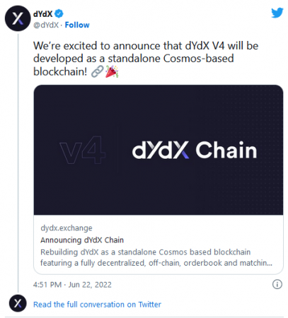 Protokol, yalnızca ademi merkeziyetçiliğe değil, aynı zamanda saniyede 1000 işlemi işleme imkanına da sahip olacağı için en uygun alternatif olarak gördüğü Cosmos’u seçti. Perşembe günü, şu anda Ethereum layer2 üzerine kurulu olan kripto türev platformu dYdX, v4 güncellemesi için Cosmos SDK ve Tendermint hisse kanıtı konsensüsüne dayalı bağımsız bir blockchain’e geçeceğini duyurdu.