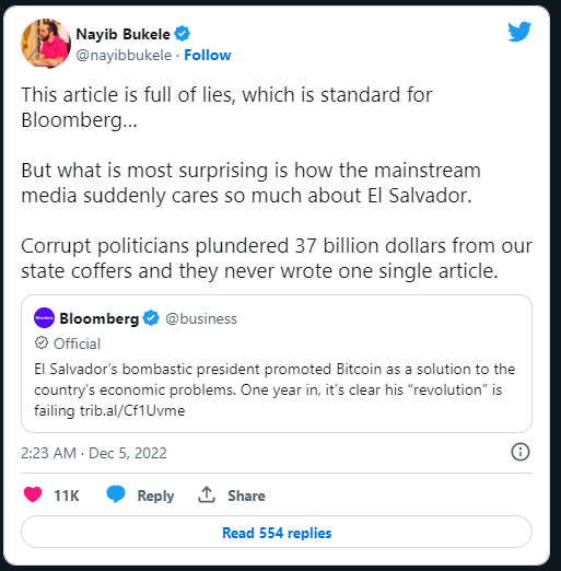 El Salvador Devlet Başkanı Nayib Bukele, ülkenin Bitcoin deneyi hakkında yayınlanan bir rapor için Twitter üzerinden Bloomberg’e karşı eleştirilerde bulundu. Bukele, 5 Aralık’ta Bloomberg makalesinin “yalanlarla dolu” olduğunu tweetledi ve medyanın yalnızca belirli konularla ilgilendiğini ima etti. Makale, esasen El Salvador’un Bitcoin’i yasal ödeme aracı yapma kararını bir başarısızlık olarak nitelendiriyor.