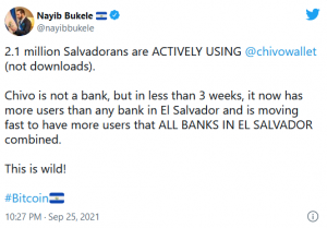 Bukele tarafından yapılan açıklamaya göre 2,1 milyon El Salvadorlu Chivo cüzdanını kullanıyor ve Bitcoin (BTC) ile alışveriş yapıyor. Bu rakam son derece iddialı çünkü ülkede hizmet veren hiçbir bankanın bu kadar müşterisi bulunmuyor. Bukele’ye göre Chivo benimsenmesi hızla artacak ve ülke hizmet veren bankalar Bitcoin’in gölgesinde kalacak.