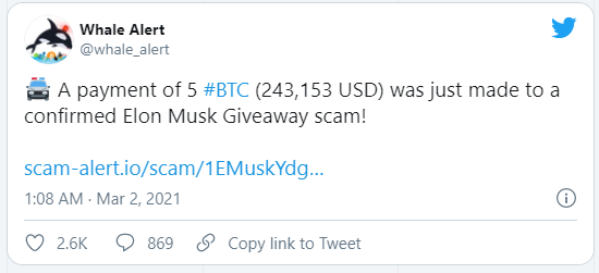 1 Mart’ta, birileri Elon Musk’ın adını ve Tesla şirketinin adını kullanarak yeni bir dolandırıcılık girişimine imza attılar. Bir scam adresi olduğu doğrulanan ve https://elon2x.com/tesla.htm ile ilişkili olan 1EMuskYdgB3BtwxpEP46txN5EAN8KnA7dE cüzdan adresine çok sayıda gönderim yapıldığı ortaya çıktı.