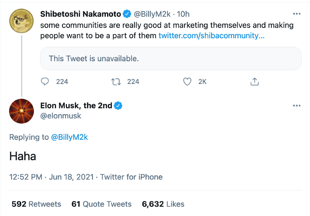 Milyarder iş adamı Elon Musk, DOGE’un rakibi olarak piyasaya sürülen Shiba Inu (SHIB) ile dalga geçti. SHIB topluluğunun Dogecoin ile ilgili yorumlarına “haha” cevabını veren Musk, Shiba Inu topluluğuna katılmadığını belirtti.