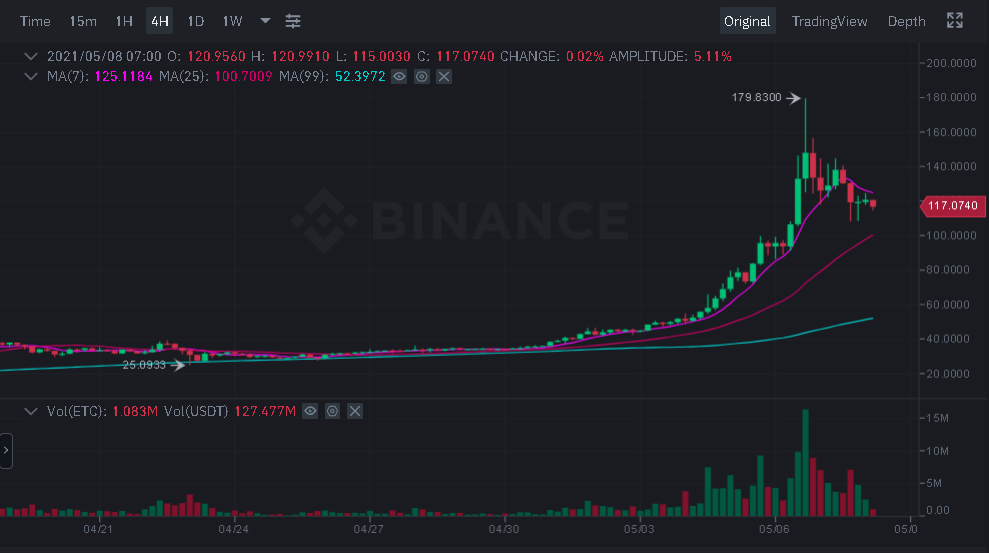 ETC her ne kadar son 24 saatte bir düşüş yaşamış olsa da hala 1 hafta öncesine göre çok iyi seviyelerde yer alıyor. Yazının yayına hazırlandığı sırada 117 dolar bandın işlem gören ETC’nin 6 Mayıs’ta 179 dolar ile rekor kırdığını söyleyebiliriz.