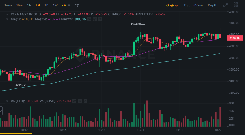 Ethereum son olarak 21 Ekim’de 4.374 dolar ile yeni bir rekor kırdı. Daha sonra Bitcoin ile birlikte bir düzeltme yapmaya başlayan ETH fiyatı 3.850 dolarlık seviyelere kadar geriledi. Ancak Ethereum bu seviyelerde çok fazla oyalanmadı ve yeniden 4.000 ve 4.100 dolarlık önemli seviyeler üzerine yükselmeyi başardı.