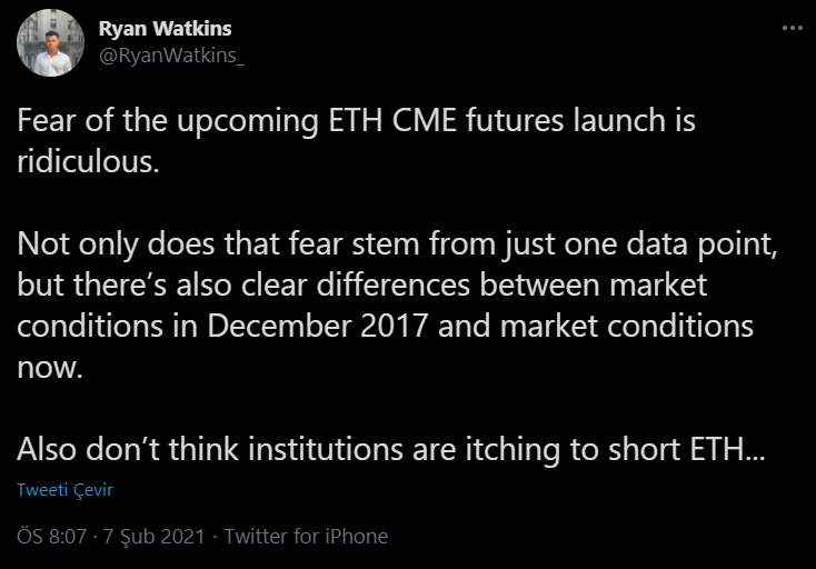 Örneğin; kripto analitiği sağlayıcısı Messari’de araştırmacı olan Ryan Watkins konuyla ilgili olarak, “Yaklaşan ETH CME vadeli işlemlerinin piyasaya sürülmesinden duyulan korku saçma. Bu korku yalnızca tek bir veri noktasından kaynaklanmakla kalmıyor aynı zamanda Aralık 2017’deki piyasa koşulları ile şu anki piyasa koşulları arasında da açık farklar var.” sözlerini kullanıyor.
