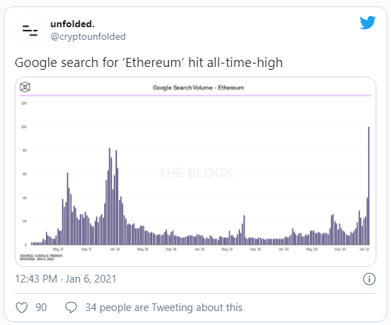Google Trends’den elde edilen verilere göre Ethereum aramaları rekor seviyeye ulaşmış durumda. Şu anda Ethereum ile ilgili aramalar, varlık 2018 yılında rekor kırdığında olduğunda daha yüksek.