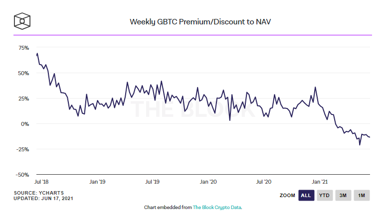 Son dört aydır GBTC indirimli işlem görüyor, yani GBTC hisselerinin piyasa fiyatı net varlık değerinden veya kısaca NAV’den düşük. Mevcut GBTC değeri %-14 civarındadır.