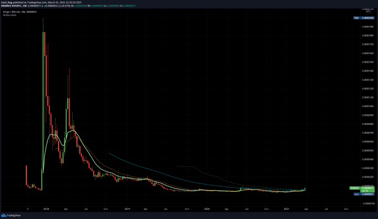 Şimdi ise daha önce XRP fiyat yükselişinin sinyallerini veren birçok analistin “ünlü XVG rallisine” işaret ettiği görülüyor. Analist Elon Pepe, Twitter üzerinden yayınladığı gönderide 618 EMA seviyesine dikkat çekti. XVG/BTC paritesine göre 618 günlük ortalamanın yani 0,00000500 seviyesinin 1.000 gündür altında olunduğuna işaret eden analist, buranın kırılması ile patlama yaşanacağını düşünüyor.
