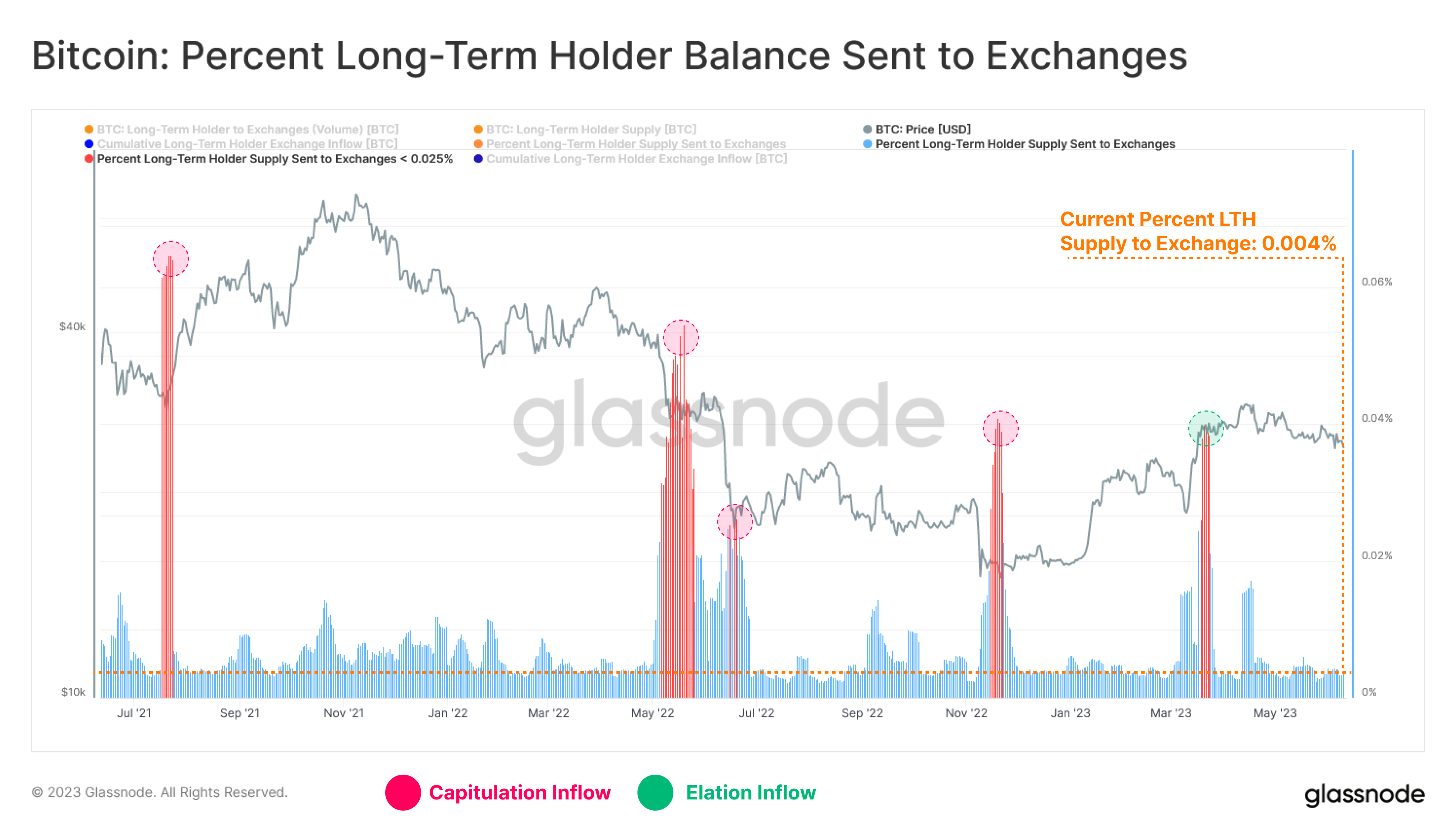 Borsalara gönderilen Bitcoin uzun vadeli hamil arzının yüzdesi, %0,004 ile son derece sessiz kalıyor. Bu, Binance ve Coinbase düzenleyici ücretlerine kayıtsız kalan, artan piyasa sıkıntısının ortasında kohortun derin hareketsizliğini vurguluyor.