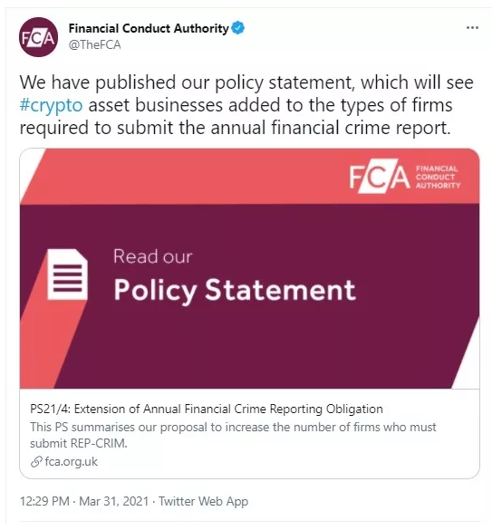 Düzenleyicinin politikası, FCA’nın potansiyel kara para aklama risklerini değerlendirmesine yardımcı olmak için dijital varlıklarla çalışan işletmeleri finansal suç raporları sunmaya zorladığı için değişmiş gibi görünüyor.