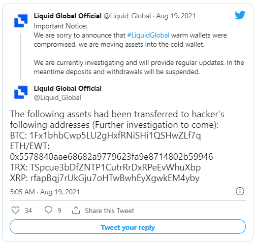 Bunlara ek olarak bir Twitter gönderisinde Liquid, kötü niyetli kişiler ile bağlantılı olan Bitcoin, Ethereum, Tron ve XRP olmak üzere 4 adres paylaştı. Ancak Liquid, tam olarak ne kadar varlığın çalındığına ilişkin henüz net açıklamalar yapmadı.