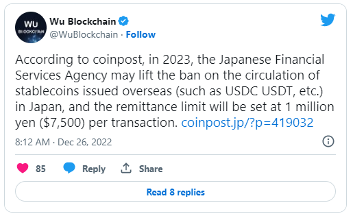 Japonya Finansal Hizmetler Ajansı’nın 2023 yılında yurtdışında yaratılan stablecoinlerin yurtiçinde dağıtımı üzerindeki kısıtlamayı kaldırması bekleniyor. Coinpost’a göre, en son ‘Revize Edilmiş Ödeme Hizmetleri Yasası’ uyarınca yeni kripto kuralları yakında uygulanacak.