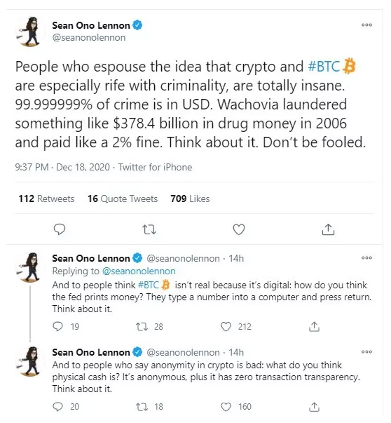 Yakın tarihli bir Twitter paylaşımında Sean Lennon, Bitcoin’den nefret edenlerle ilgili dünyanın en büyük kripto para birimine karşı takındıkları tavır sebebiyle büyük eleştirilerde bulundu. Lennon’ın eleştirdiği söylemler arasında Bitcoin’in suçlular için bir para birimi olduğu, kara para aklamak için kullanıldığı, Bitcoin’in gerçek olmadığı ve lider kripto para biriminin tamamen yasaklanması gerektiği gibi ifadeler bulunuyor.