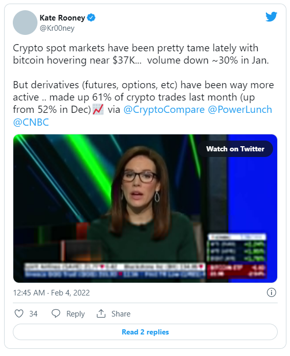 Rapor, büyüyen türev piyasasının “katılımcılar vadeli işlemlere ve opsiyonlara yöneldikçe, Ocak ayında kripto para piyasalarında riskten korunma ve spekülasyonda bir artış” gösterdiğini ifade ediyor. Pazar payındaki kazanıma rağmen, türev piyasa hacimleri Mayıs 2021’de görülen tüm zamanların en yüksek seviyesi olan 4,96 trilyon doların altında kalmaya devam ediyor.