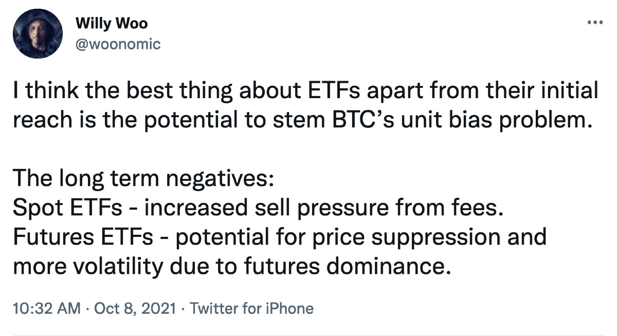 Özellikle vadeli işlemlerin bu hafta incelenmesinde Makro analisti Alex Krüger,vadeli işlemlere dayalı alternatifin aşırı risk taşımasından dolayı spot tabanlı bir ETF’in büyük hacimli kurumsal müşteriler için çekici tek seçenek olacağına inanıyor.